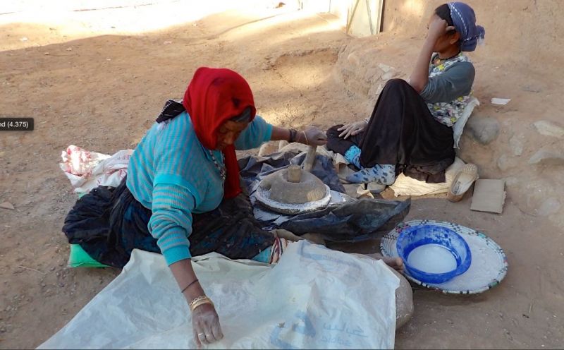 vrouwen zijn met een steen meel voor brood aan het malen.