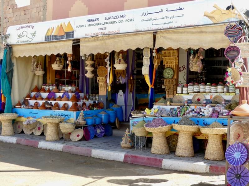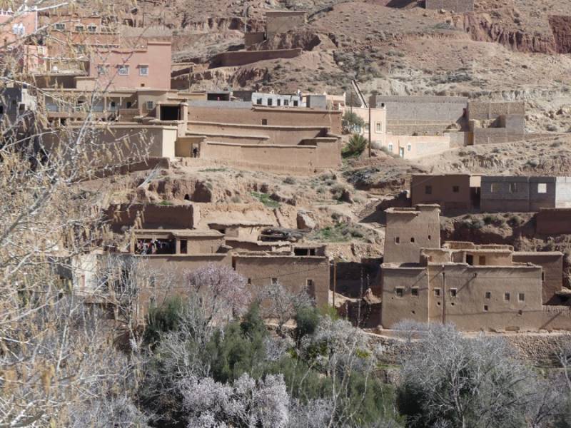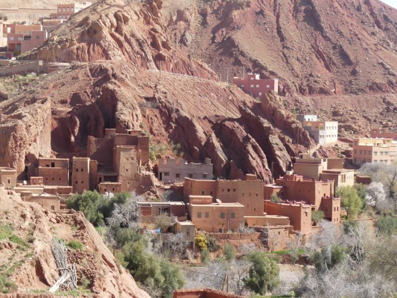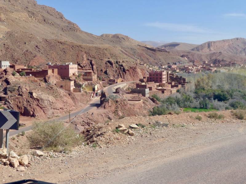 De 1ste 35 km van deze route is erg mooi . Niet door de lintbebouwing, het is een aaneenschakeling van dorpjes, maar omdat je langs de bedding van de Dadès rijdt waar op dit moment allemaal fruitbomen in bloei staan. Dit stuk wordt ook de route des Kasbah’s genoemd omdat er veel kasbah’s staan, het merendeel vervallen . Bovendien zie je rechts de besneeude toppen van de Hoge Atlas.We zijn door het dorp El Kelaa des Mgouna gereden waar alles in het teken van de rozen staat, je hebt er winkeltjes met gedroogde rozenblaadjes, rozenparfum, rozenwater en rozenzeep en andere cosmeticaproducten.