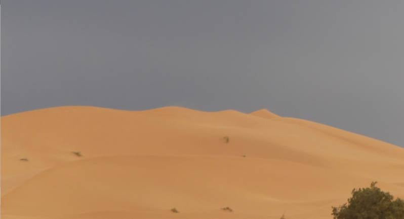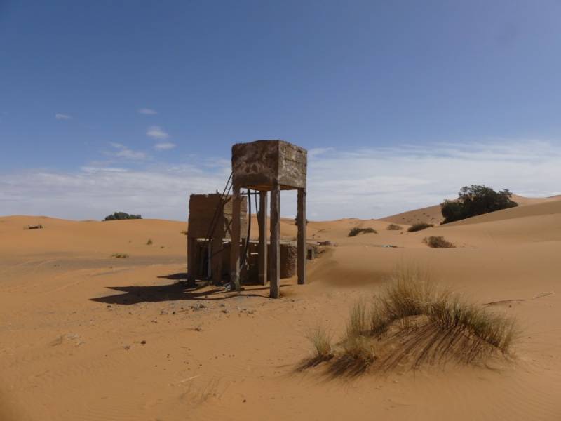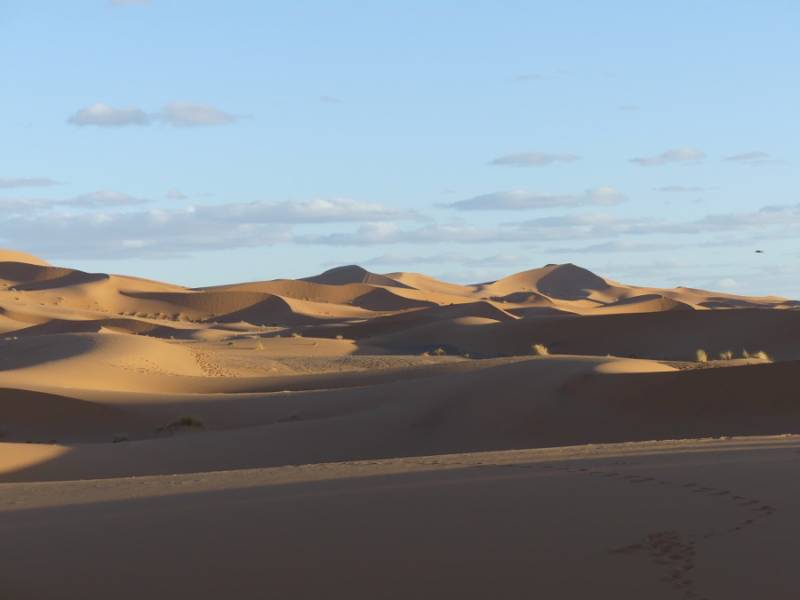 Er trok vanmorgen een wolkenveld over en even dachten we dat het zou gaan regenen want regenen kan het hier wel degelijk in de woestijn. In mei 2006 zijn hier hevige onweersbuien gevallen met overstromingen ten gevolge, 30 mensen zijn toen verdronken. 10 hotels zijn toen verwoest en 20 andere liepen zware schade op evenals veel huizen in het dorp Merzouga.