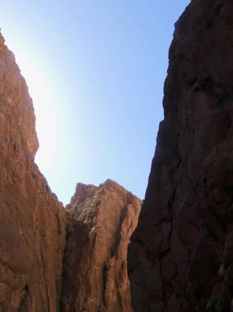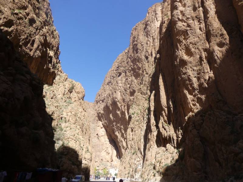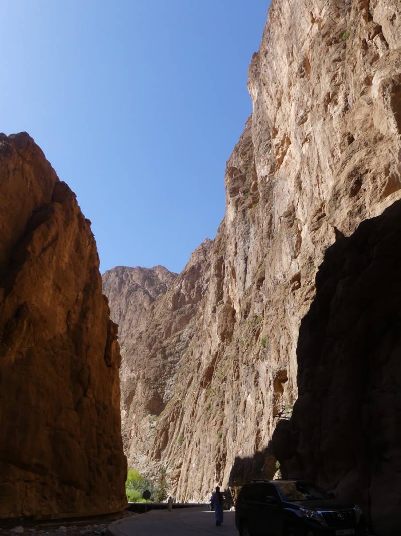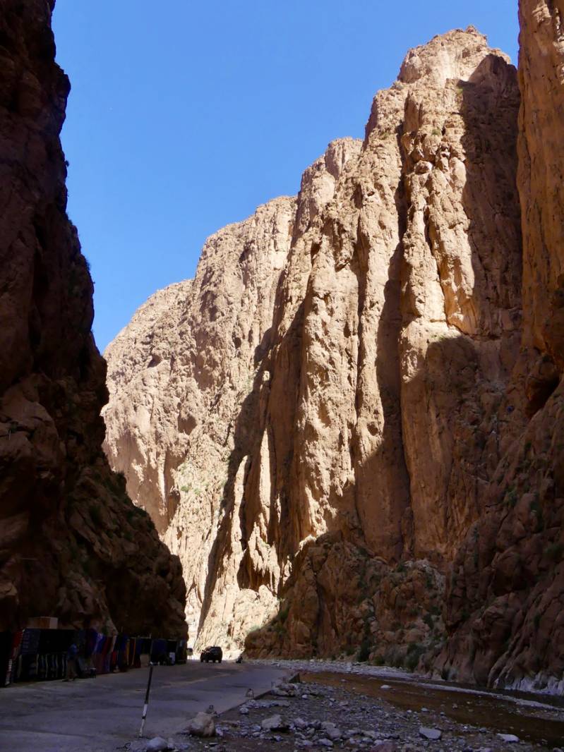 We zijn via de vernieuwde weg naar de Todra kloof gereden, een paar jaar geleden was men de weg aan het verbreden. De route langs de vallei van de rivier de Todra is al mooi met wat vergezichten, de kloof is prachtig . We zijn er doorheen gereden en nadat we gekeerd waren hebben we de camper geparkeerd en zijn we door de kloof gewandeld. Dan voel je je nietig , de steile wanden gaan loodrecht omhoog tot wel 300m. En dan zijn er ook nog waaghalzen die daar bergsport beoefenen, als vliegen hangen ze tegen de wand, gelukkig hebben wij nooit die neigingen gehad, je krijgt al pijn in de buik als je daar naar kijkt.