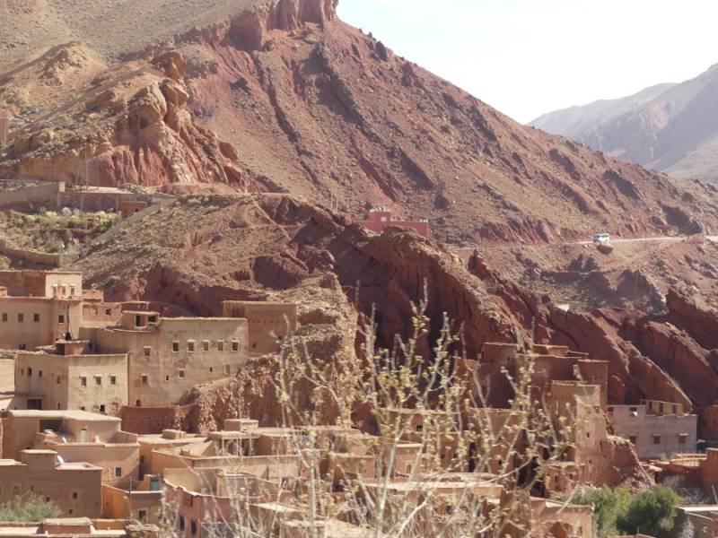 We zijn 16 km de Dadès vallei ingereden en dat was weer een lust voor het oog. Vooral in het begin is de bedding breed daar liggen fel groene akkertjes en bloeiende fruitbomen. Je ziet oude dorpjes, donkerrode rotsen en mooie panorama’s.