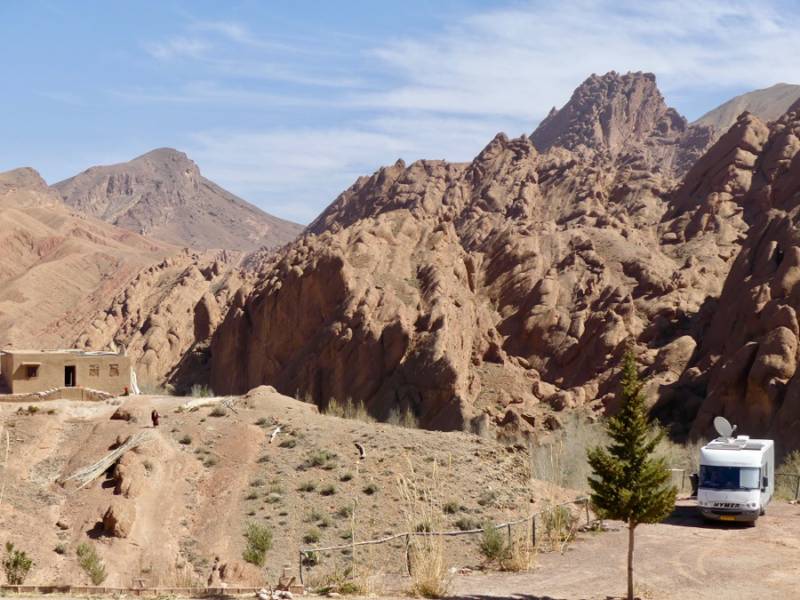 We kijken vanaf de camping op de besneeuwde toppen van de Hoge Atlas, zelf zitten we op 1278m hoog. Toch is het op deze hoogte de afgelopen dagen 23º met stralend weer.