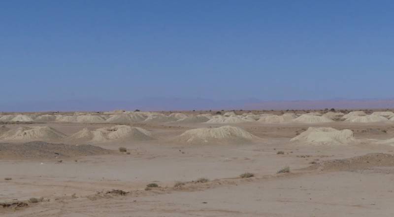 Want de merkwaardige hopen die je in het landschap ziet zijn foggaras, waterputten die onderdeel uitmaken van een ondergronds irrigatiesysteem. In 1100 is dit systeem aangelegd, water kwam over een afstand van 45km, en 50m diep , uit de bergen naar de palm-akkers in de oase van Ferza om die te bevloeien