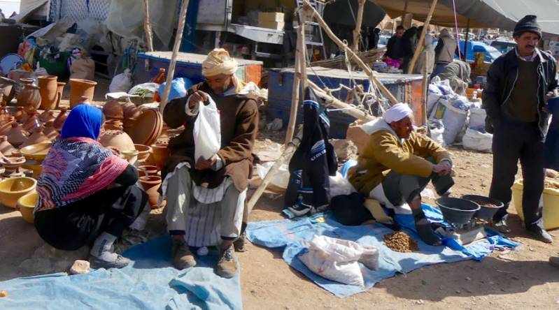 Halverwege hebben we een lifter meegenomen die naar de wekelijkse souk in Zagora ging. Dat kwam goed uit, wij wilden er ook heen want we moesten fruit en groente kopen. De souk is verplaatst naar zo’n 2km buiten Zagora vlakbij de N12 naar Foum Zguid. Dat vonden we jammer, eerst was de souk in het centrum, dat vonden wij sfeervoller.