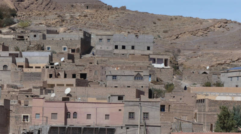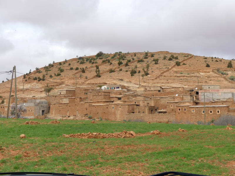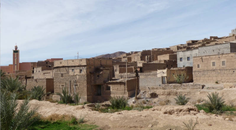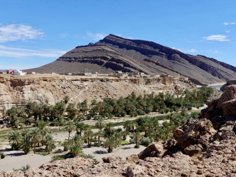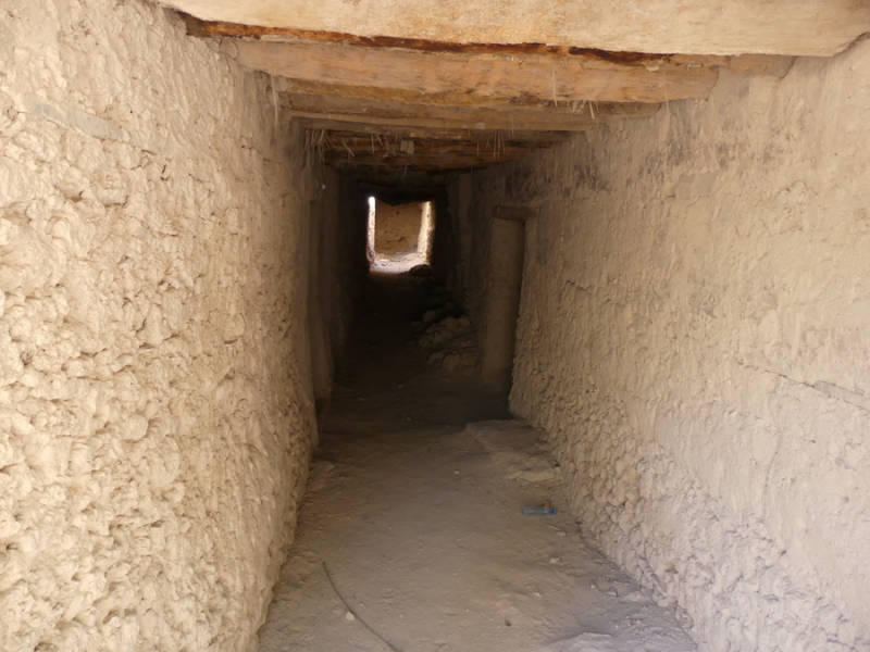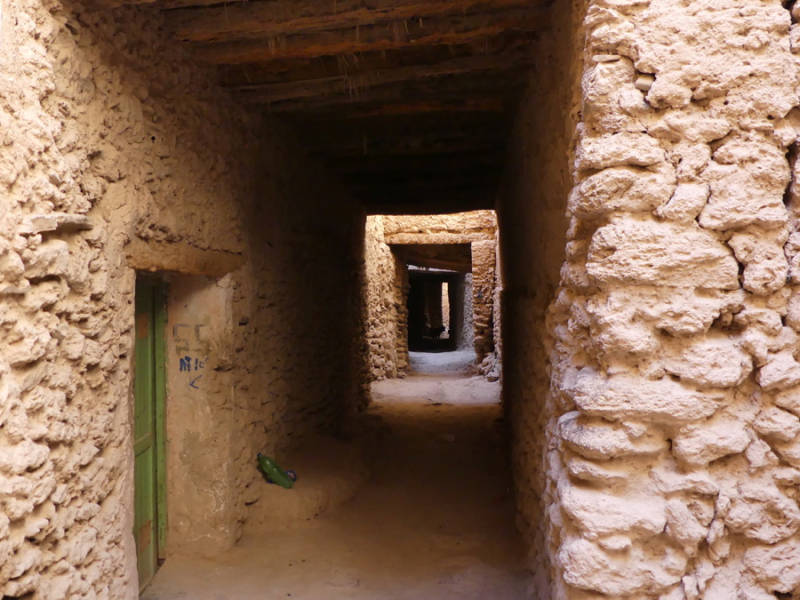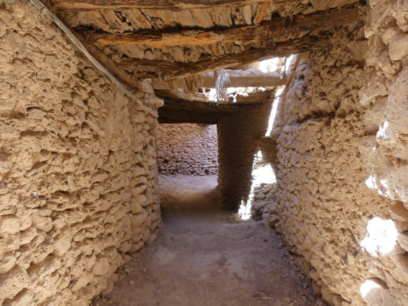 In de oase liggen een 30-tal ksar( meervoud van ksour) ,versterkte dorpen. We zijn door zo’n dorp gewandeld, veel straatjes lopen onder de huizen van pisé (leem met stro) door. Daarna zijn we door de oase met zijn veldjes waar groenvoer voor het vee wordt verbouwd, gelopen. De veldjes worden geïrrigeerd door een heel systeem van kleine kanaaltjes.