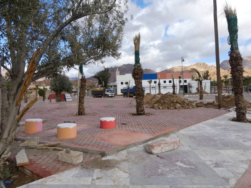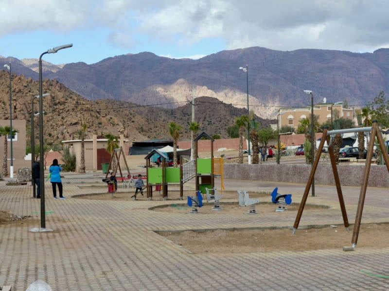 We komen al sinds 2008 in Tafraout en hebben het stadje enorm zien veranderen. Was het eerst erg stoffig met slechts een enkele straat geasfalteerd, nu ziet het er fris uit, straten zijn goed, er zijn muurschilderingen en voortdurend worden er nog verbeteringen aangebracht. De trottoirs zijn op sommige plaatsen on-Marokkaans mooi (langs de toegangsweg langs het postkantoor met marmer betegeld), er zijn mooie pleinen en parkjes gemaakt, en er is een speeltuintje.