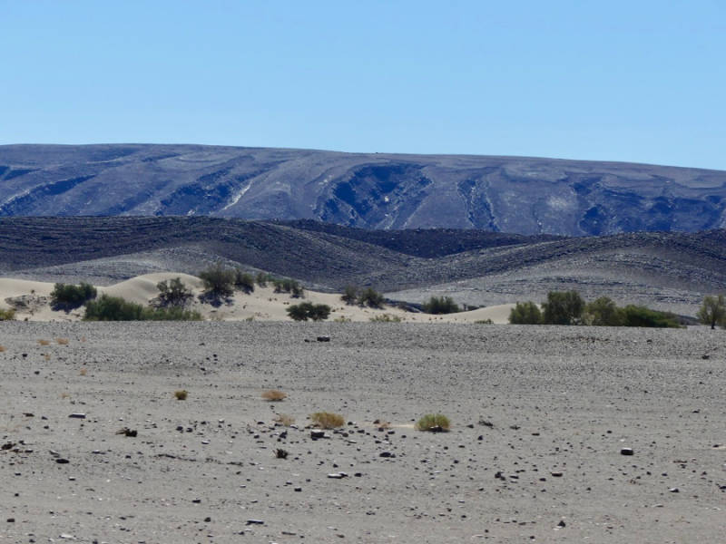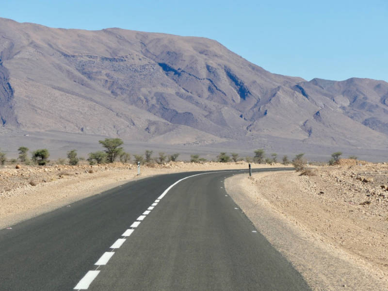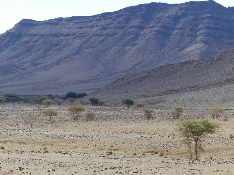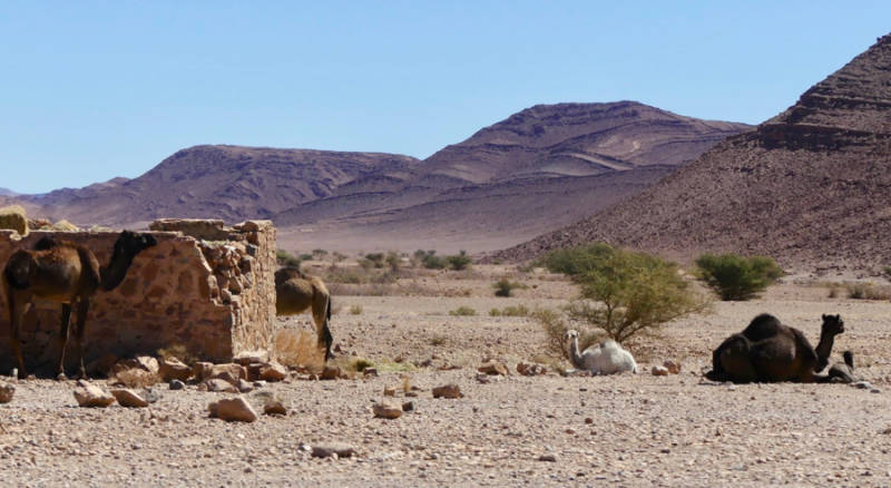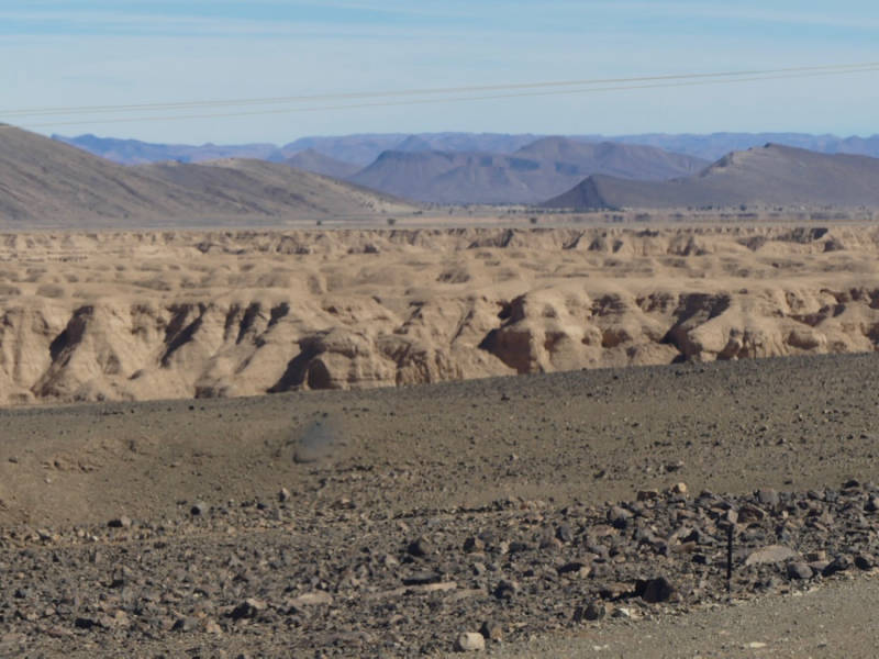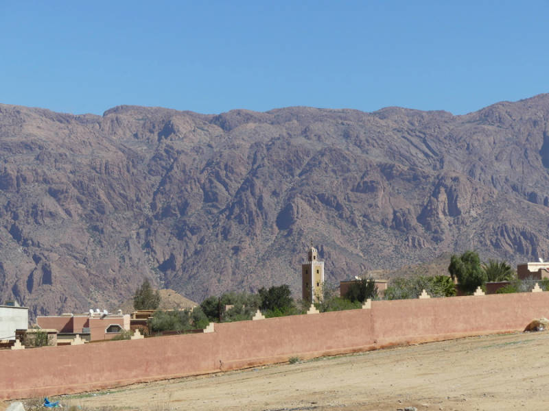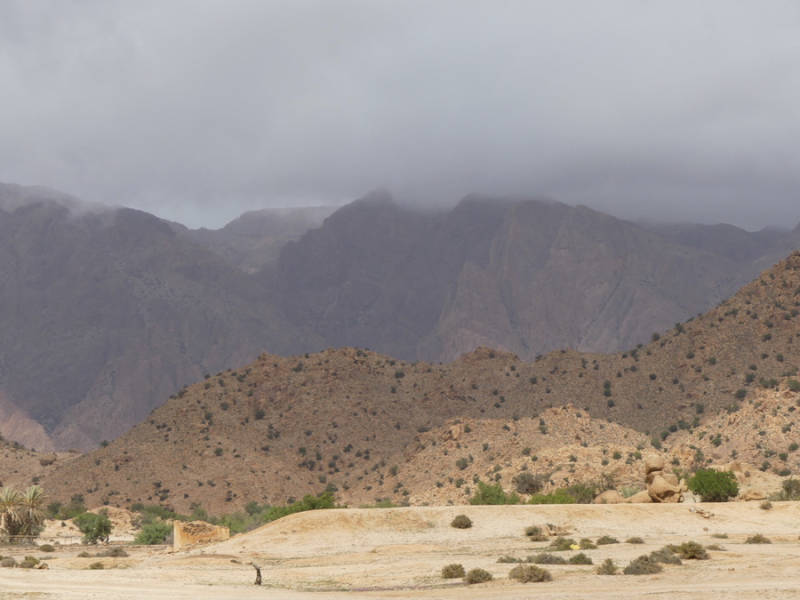 Het was maar 70km naar Tissint via een goede weg, nog onlangs geasfalteerd zo te zien. De route ging door een mooi landschap door een breed dal met aan weerszijden een bergketen. Een enkele keer een oase, een enkel dorp en verder een kale vlakte met waaibomen, maar wat mooi.