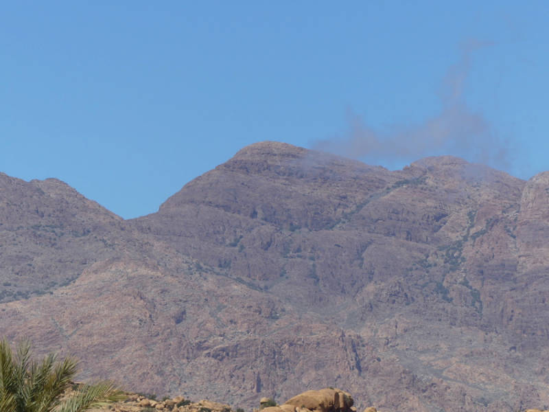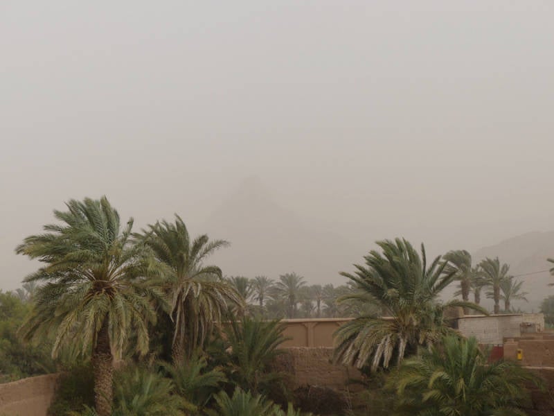 Aan het eind van de ochtend nam de wind toe en kwamen er windstoten tot zo’n 70km per uur en in het begin van de middag werd de zon eerst versluierd en daarna grotendeels verduisterd, we hadden een zandstorm light. Light omdat we wel buiten konden zitten, je werd wel wat rood van het fijne Saharazand en light omdat je nog wel 200m kon zien. We hebben een paar x een zandstorm meegemaakt in Marokko, de ergste was toen we uit de West Sahara , Tarfaya, naar Guelmim moesten rijden. We hadden op de Marokkaanse tv gezien dat er een zandstorm zou komen en dachten die voor te zijn. Maar we werden er door ingehaald en konden minder dan 50m zien, er waren een auto en een vrachtauto van de weg geraakt, wij kwamen bekaf in Guelmim aan.