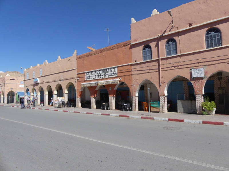 Het was 120km van Foum Zguid naar Zagora via de N12 die sinds enkele jaren geen piste meer is maar geasfalteerd, een rit van ongeveer 2 uur. Het is de 3e keer dat we deze weg rijden en we vinden de route tamelijk saai, misschien dat we verwend zijn door mooie landschappen. Een enkel dorpje in een oase, en verder een tamelijk kale vlakte met wat waaibomen af en toe.