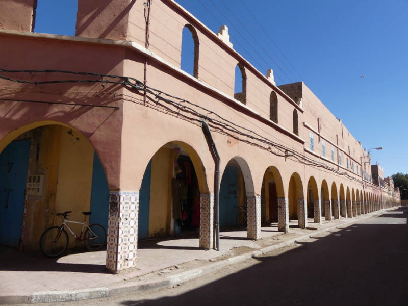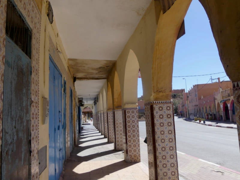 De arcaden in Tata, schaduwrijk. De meeste winkeltjes zijn op dit moment gesloten, even naar de moskee