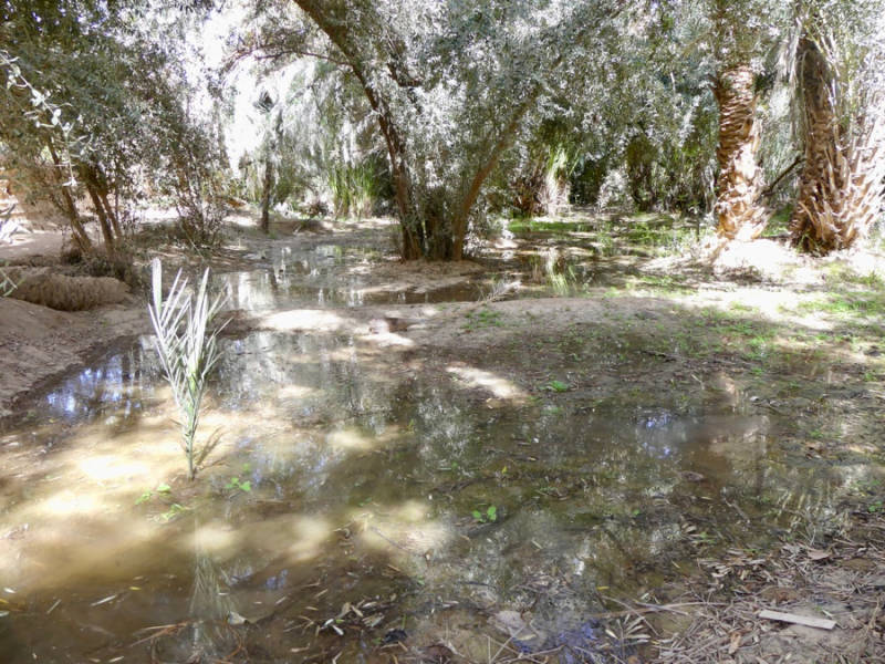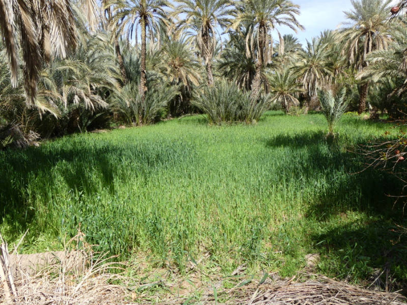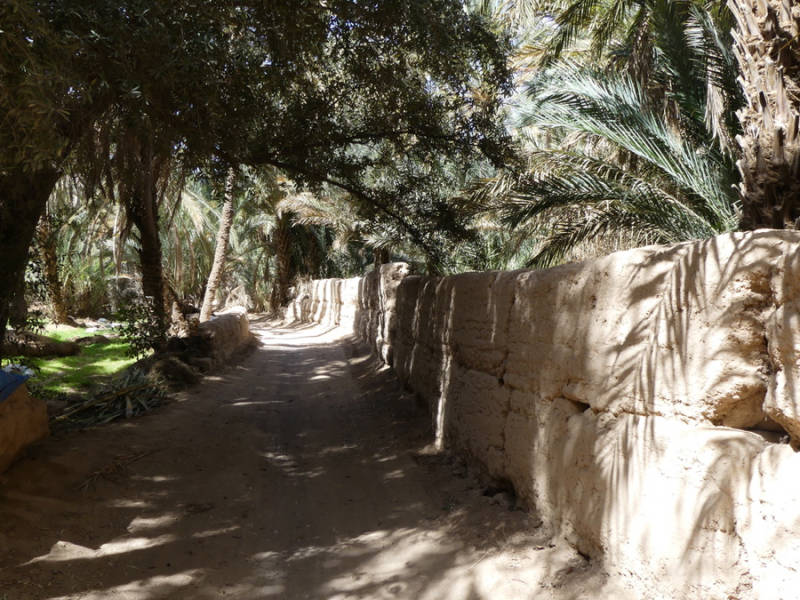 het is prettig wandelen door de oase over de paden met aan weerszijden de veldjes met groenvoer onder de palmbomen