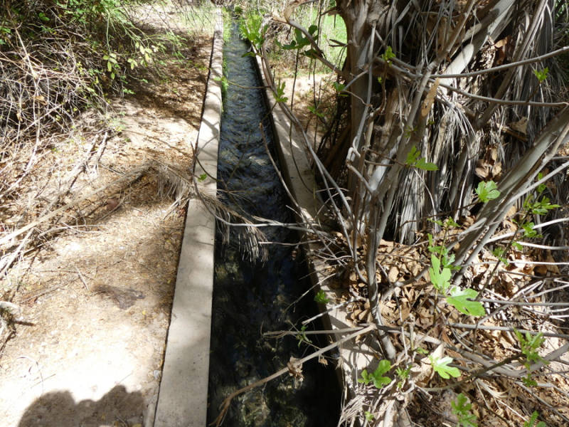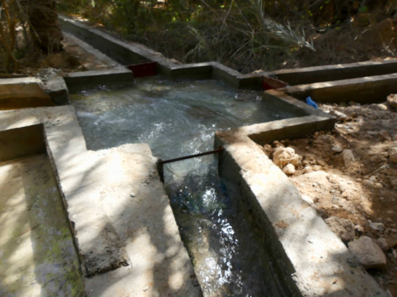 vaak zie je nog aarden walletjes bij het eeuwenoude irrigatiesysteem, hier is het beton, middelste foto laat de schuiven zien om te bepalen in welk kanaal het water stroomt en op de rechterfoto een bevloeid veld