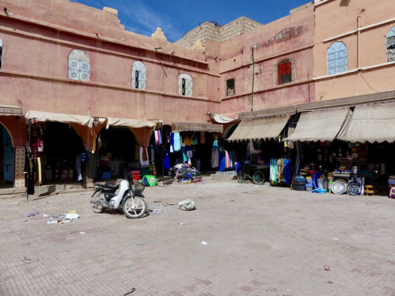 Vandaag was er souk in het centrum, er is elke dag wel een soort souk, langs een straat bij het centrum, maar niet zo groot. Een beetje een rommelige sfeer maar wel leuk en vooral kleurrijk door de vrouwen met hun mooie kleren. Volgens de beheerder van de camping zou de souk de hele dag zijn, dus wij gingen om een uur of 2, konden we meteen een hapje eten in de stad. Het is nog geen kwartier lopen naar het centrum vanaf de camping en we vonden het al verdacht uitgestorven op straat , weinig winkeltjes open en weinig mensen. En wat bleek, de souk was al afgelopen, slechts wat arme sloebers verzamelden wat achtergebleven groente en fruit. En dan was het ook nog te vroeg voor de dagelijkse souk, daar gingen kraampjes zo langzamerhand pas open, gelukkig hadden we daar gisteren al over gewandeld. Het kostte ook nog moeite om ergens iets te eten te vinden, doorgaans staan er overal tajines te pruttelen en stijgt er rook op van de barbecues. Uiteindelijk toch nog een gelegenheid gevonden waar we citroenkip met frites voor 60dh konden eten.