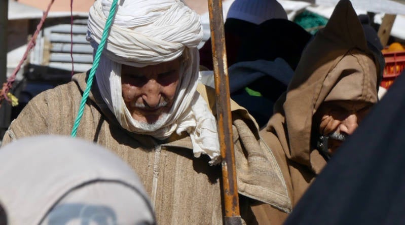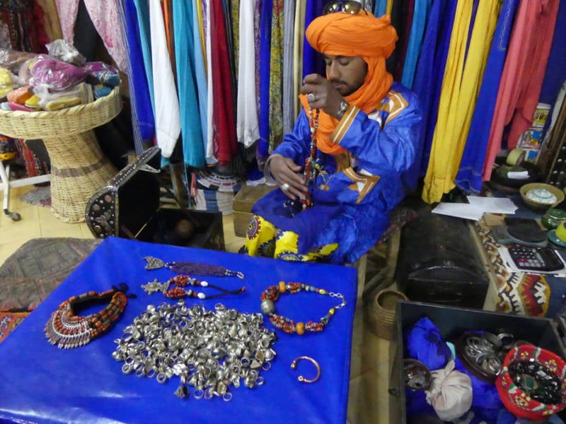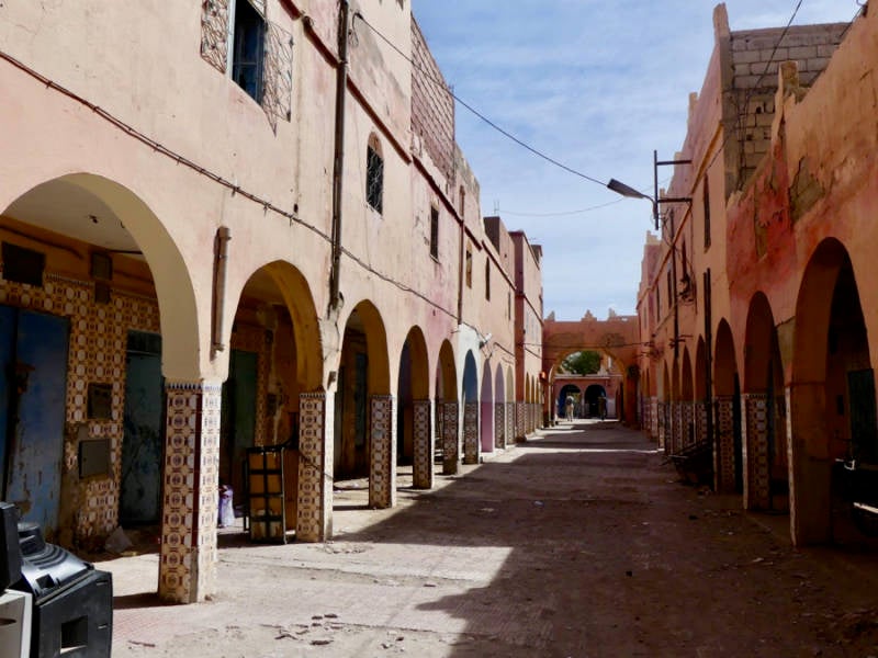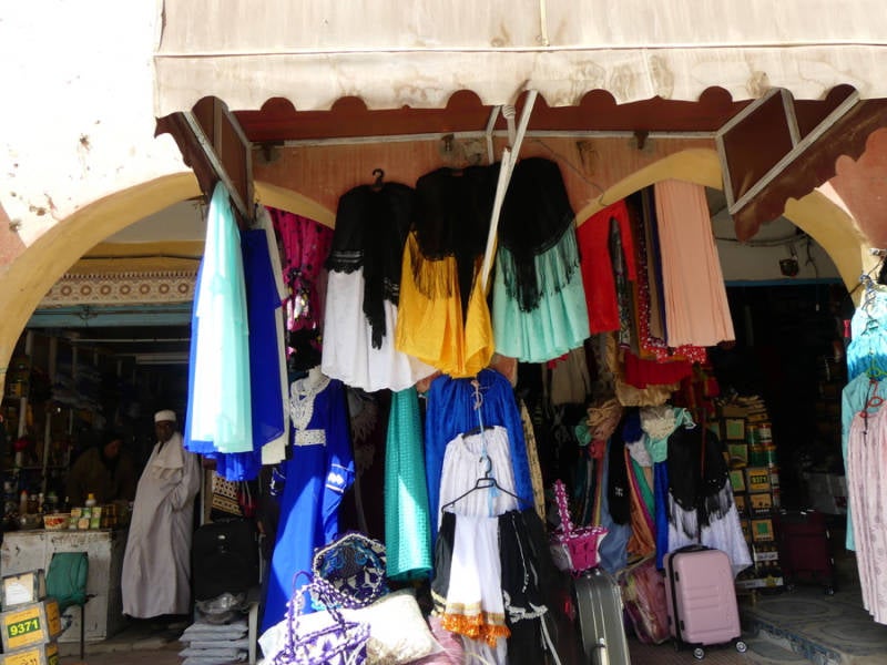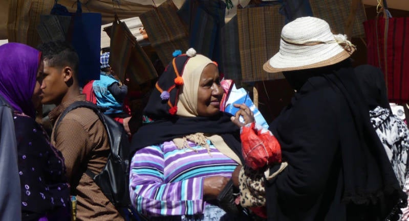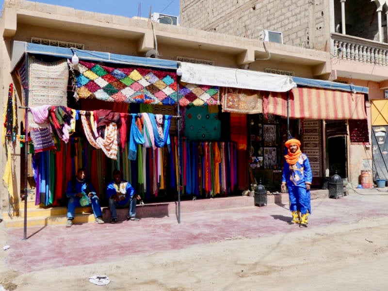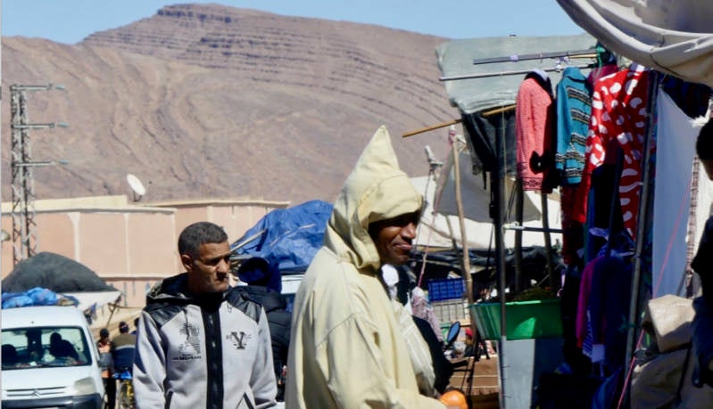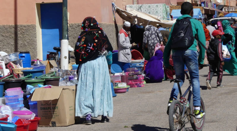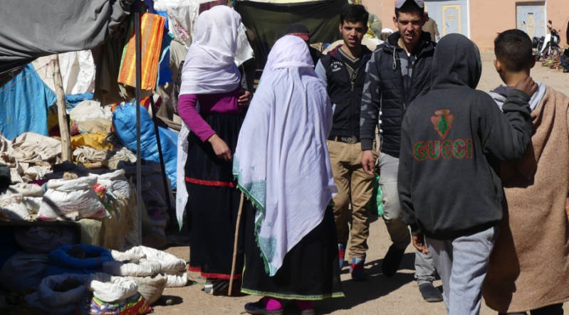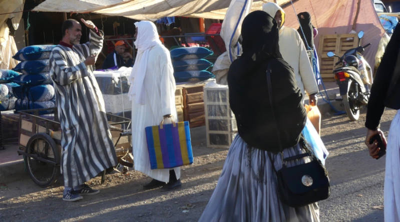 de souk in Foum Zguid, 10 jaar geleden zag je veel meer vrouwen met zwarte doeken met gekleurde bolletjes