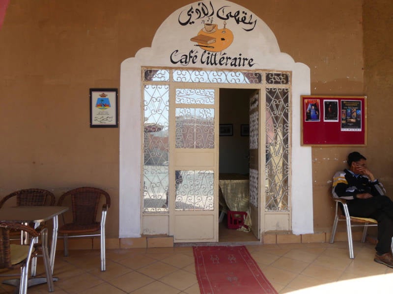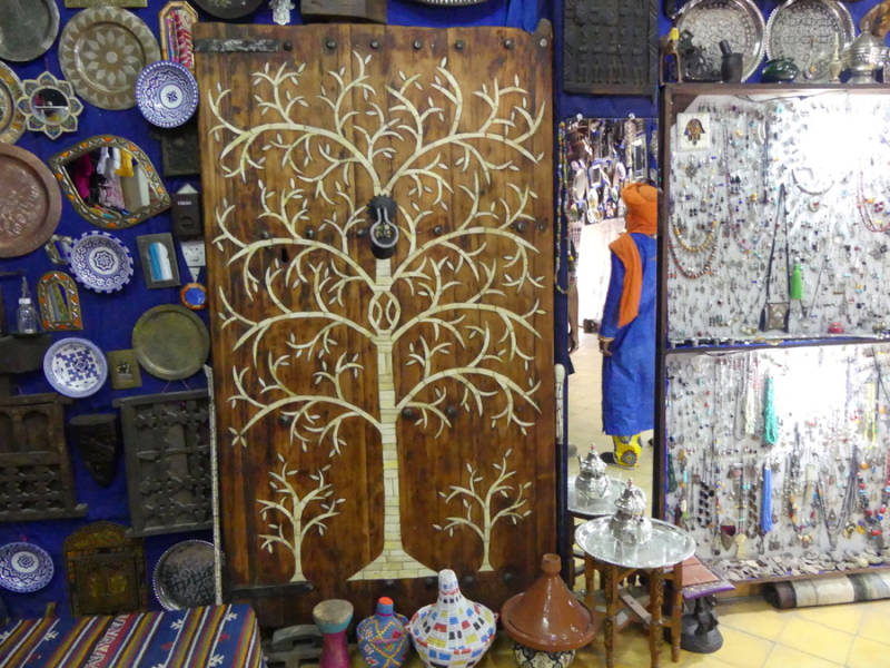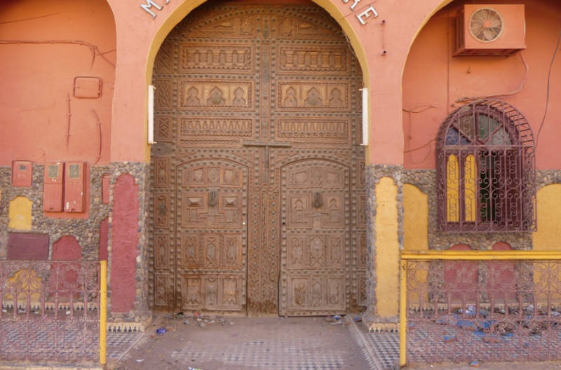 Zagora: een oude deur iets verder foeilelijke moderne terrassen een authentiek restaurant naast een winkel gericht op toeristen