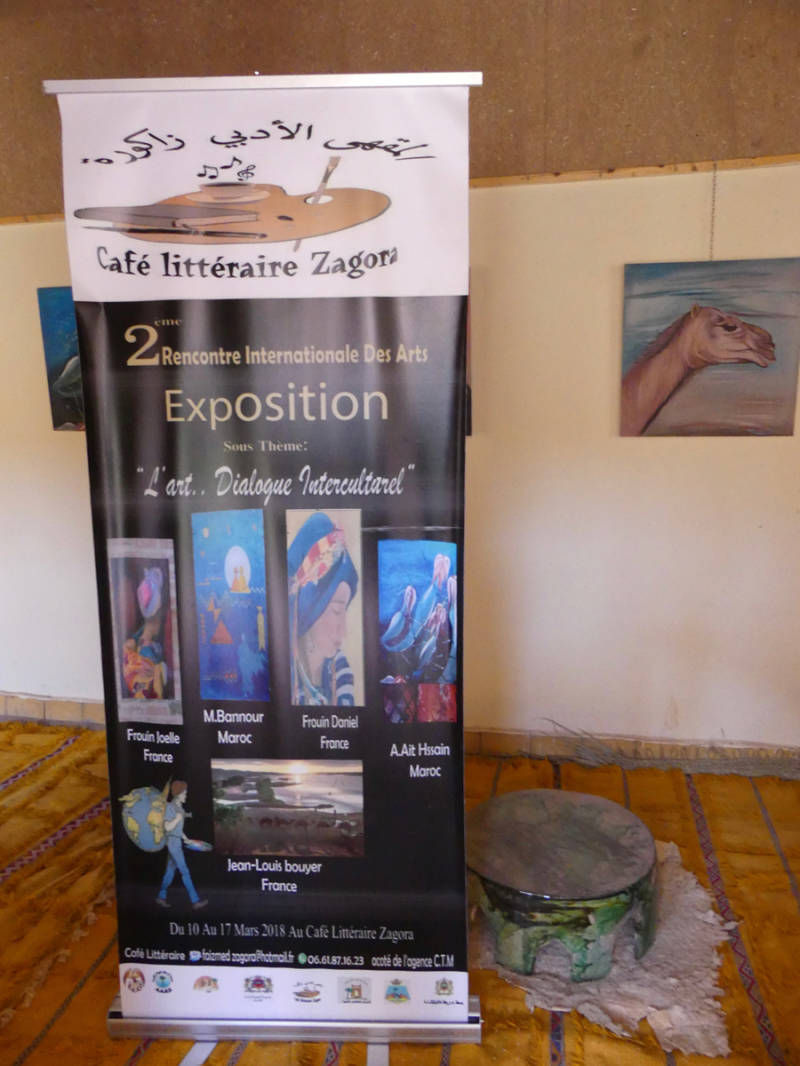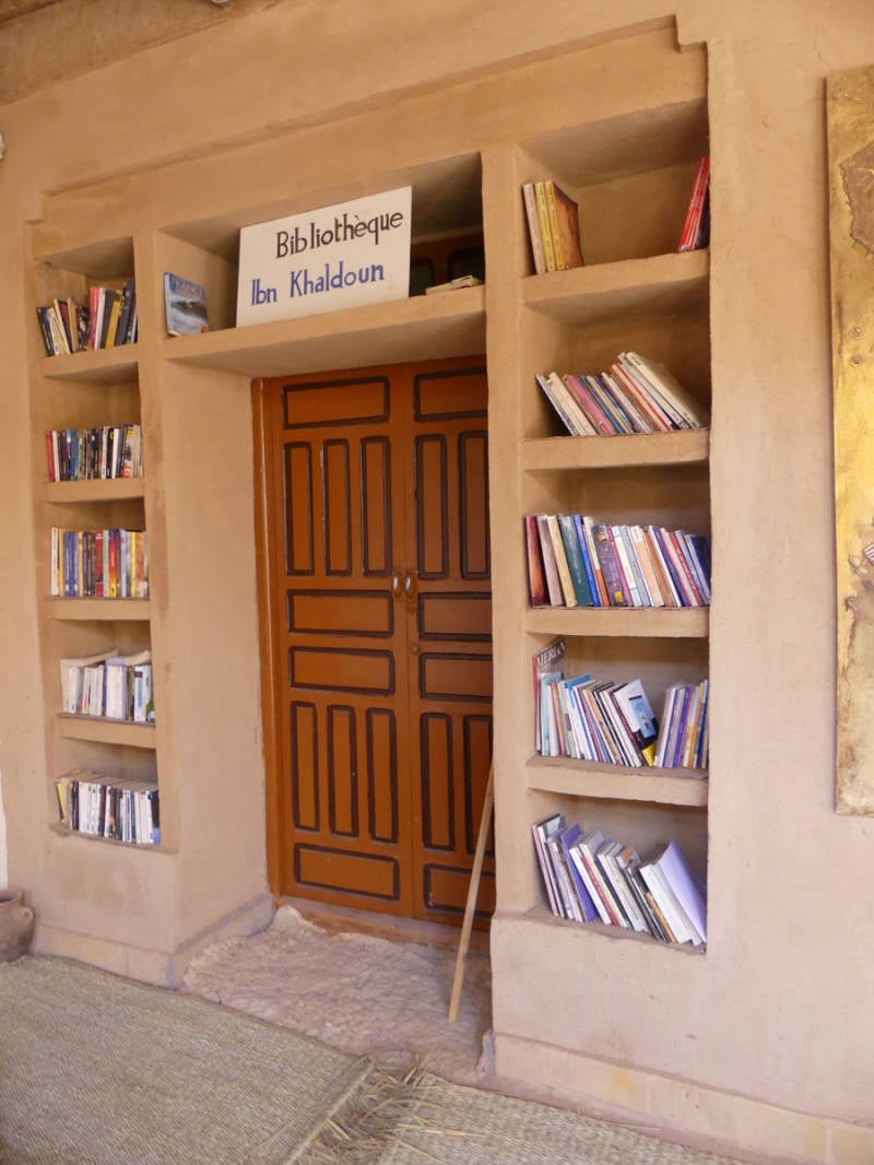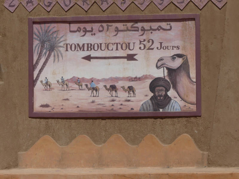 We zijn ook binnengeroepen bij het literaire café, w.s. omdat ons de naam integreerde . Er bleek inderdaad een bibliotheek binnen te zijn maar het is ook een eeuwenoud gebouw waar exposities plaatsvinden. We werden uitgenodigd om een opening bij te wonen van een schilderijententoonstelling vanavond om 19.00 uur maar zelfs als er geen zandstorm was geweest was het twijfelachtig of we er wel heen waren gegaan. De schilderijtjes die wij zagen waren net zo kitscherig als het Timboektoe 52 dagen bord.
