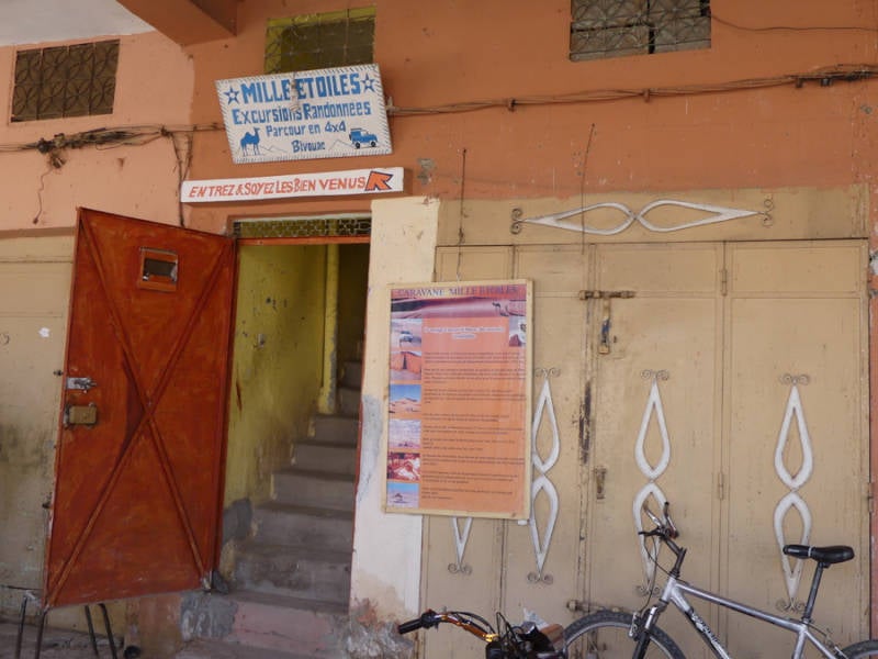 een van de 'Dakar' garages en de winkel waar we naar binnen zijn geweest, aardige knaap , mooie winkel , de deur is ingelegd met bot van dromedarissen