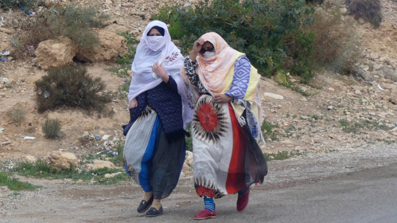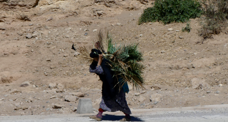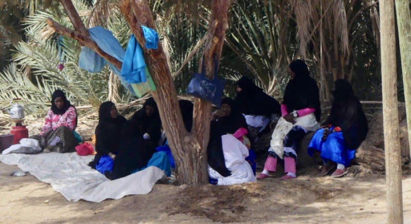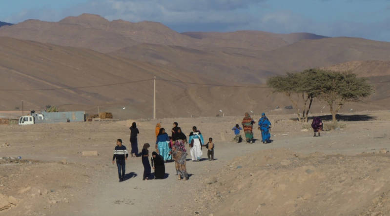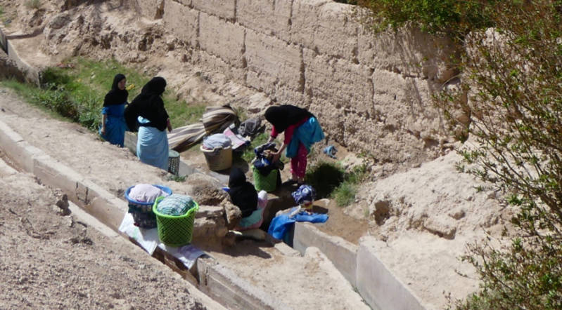 het dorp Agadir Lehne waar het waterhorloge is. vrouwen doen de was in een irrigatiekanaaltje picknickende vrouwen