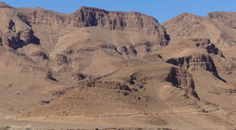 Dat is de R109 een wonderschone route die geldt als één van de mooiste van Marokko. Je rijdt door een breed dal, voor het grootste deel gevormd door een droge rivierbedding. Aan beide zijden heb je dan bergketens die bestaan uit geplooid gesteente. Wij noemen ze gekamde bergen omdat het net is of er iemand met een reusachtige kan patronen in de bergen geeft aangebracht. Af en toe passer je een oase en na 3 uur rijden kwamen we in Tata aan, we hadden toen zo’n 160km gereden.