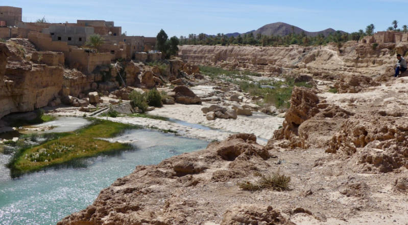 Een kleine afdaling naar het dorp Tissint en we kwamen bij een plateau bij een waterval in de rivier de Tissent . De waterval heet Atiq, het zijn er eigenlijk meerder en ze zijn 2 tot 3 meter hoog.. En omdat het prachtig weer is, 27º , zijn er jongeren aan het zwemmen en duiken van de rotsen af het water in, het water is brak dus geen gevaar voor bilharzia. Er zijn hier koereigers, kleine zilverreigers en honderden verschillende zwaluwsoorten in de lucht.