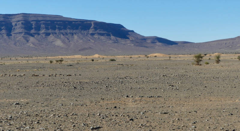 Het landschap waar de weg doorheen gaat is zo vlak dat je Foum Zguid al van meer dan 20km afstand kunt zien liggen.