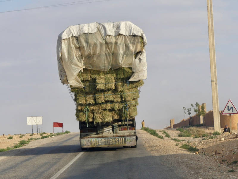Ondanks dat de weg smal is en de lading strobalen linksboven behoorlijk ver uitsteekt, konden we de vrachtauto toch passeren