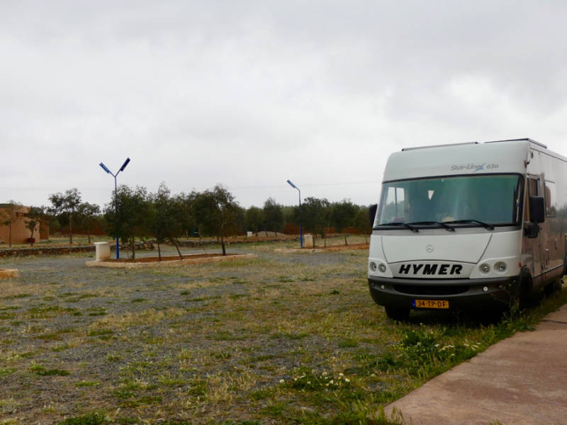 Een eerste groene zweem kwam over de aarde, kleine grassprietjes staken de kop op, als teken dat we in een ander klimaat terecht kwamen. We zijn doorgereden tot Lamrija, daar is een hotelcomplex met een grote camperplaats waar behalve wij ook een Spaanse 4WD met een tentje op het dak staat. Het ziet er hier mooi verzorgd uit, goed sanitair, daar is de prijs wel naar 80dh en 10dh voor de stroom die we maar hebben genomen vanwege de kou en motregen. We staan 35km voor Guercif en waren precies om 10.00 uur op de camperplaats na 150km gereden te hebben. En jawel, toen begon het hard te waaien met windstoten, goed dat we bijtijds zijn opgestaan. Om 12.00 uur was het bijna windstil en begon het harder te regenen.