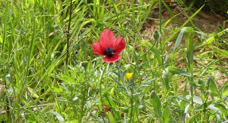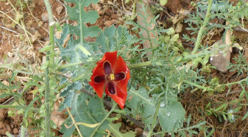 Zondag, regendag, we werden al vroeg op buien en een stormachtige wind vergast. Maar aan het eind van de ochtend kwam de zon er ook aardig door. Na nog een buitje in het begin van de middag bleef het verder droog en hebben we een kleine wandeling gemaakt tussen de olijfbomen en bloeiende bloemen. We hadden zicht op de djebel Bou Serai, de berg lag nog onder de bewolking. De wind bleef stevig doorwaaien, zo. 60km p.u. en het werd 15º.