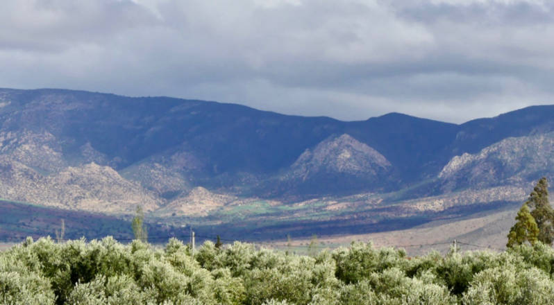 Bergen met schaduwen van wolken er staan hier eenvoudige boerderijtjes waar wat kippen omheen scharrelen