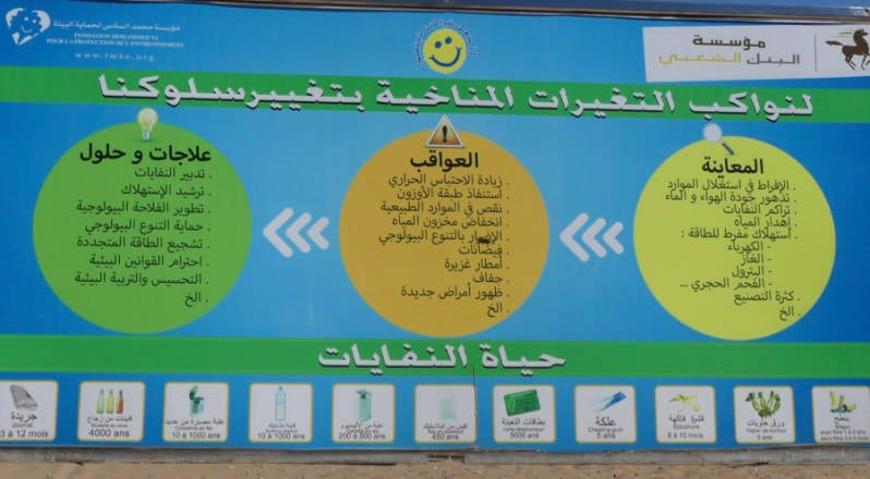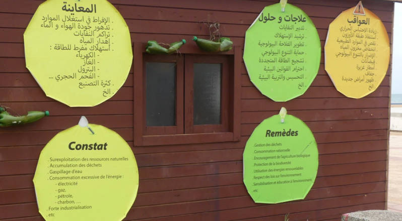 Overdag zijn we in Arekmane gebleven, het was zonnig maar er was wel veel wind. Ieder jaar schrijven we wel over tegenstellingen in Marokko, bv over arm en rijk. Dit jaar nog niet gedaan, op de valreep maar eens een tegenstelling die ons hier opvalt. Op een bord bij het strand wordt opgeroepen om het strand schoon te houden, er staat bij hoe lang het duurt voordat een bepaald product door de natuur weer afgebroken is, bv een telefoonkaart 5000 jaar, glazen fles 4000 jaar, plastic zak 450 jaar. Ook staat er een gebouwtje vlakbij waarop staat in het Arabisch en Frans welke milieuproblemen er zijn geconstateerd en wat je er zelf tegen kunt doen. Zo wordt er geprobeerd om een milieubewustzijn te kweken en zijn ook de plastic zakken bv al 2 jaar verboden.