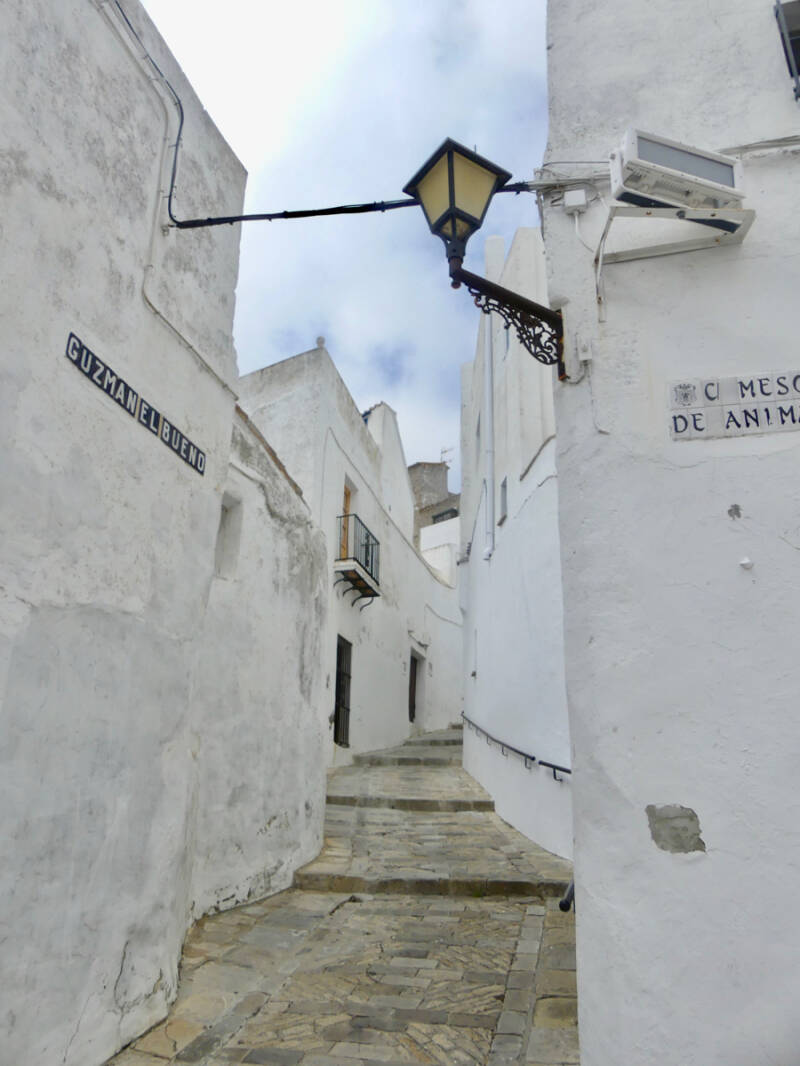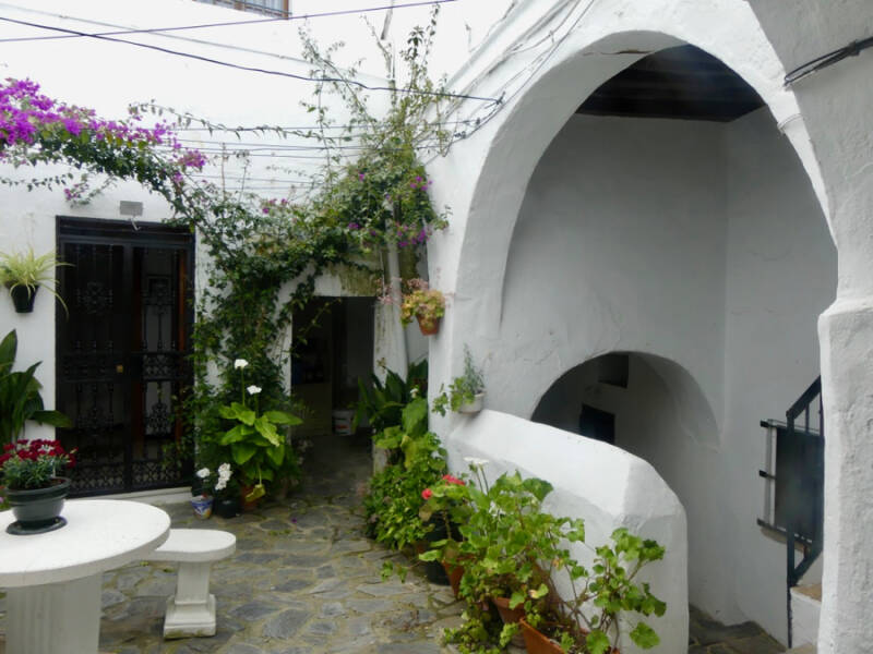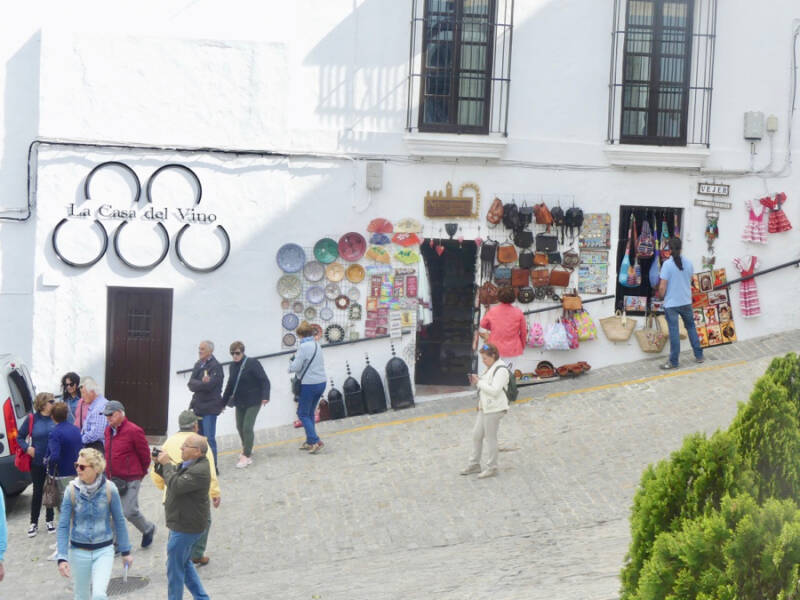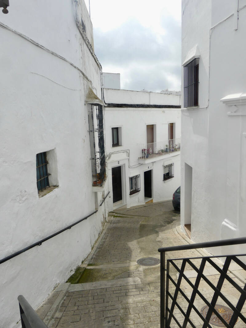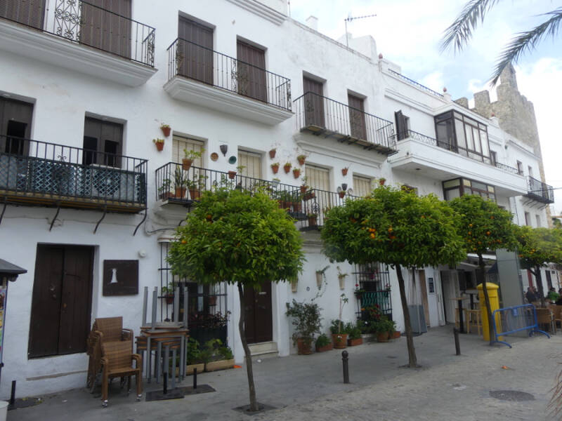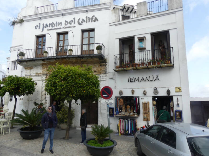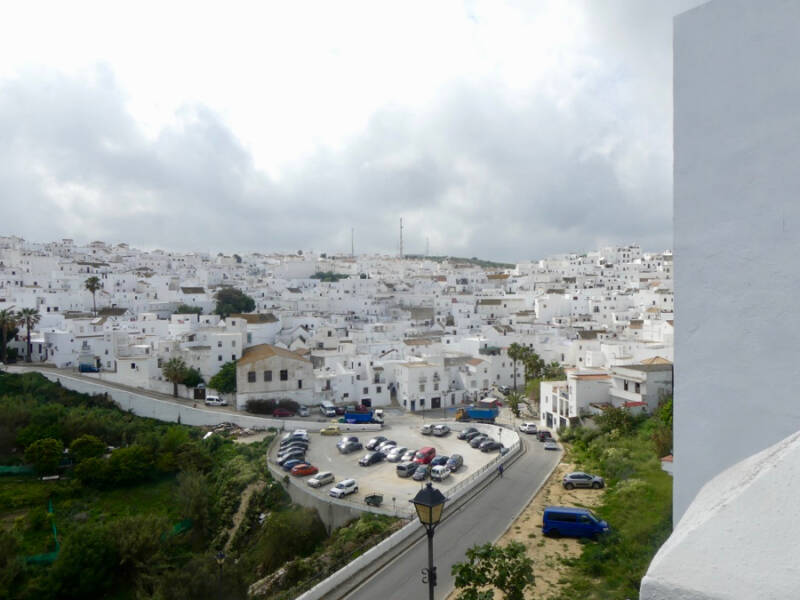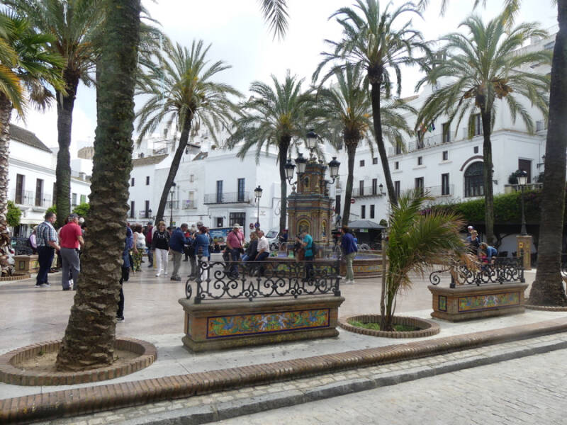 Via een paar trappen kom je in het hoog gelegen oude deel van het stadje met nauwe, pittoreske, straatjes en wat bezienswaardigheden. Een paar binnentuinen waren te bezichtigen, deze patio’s verraden ook het Moorse karakter, net zoals in Marokko zijn de kamers rond deze patio. Maar dat bezichtigen viel nog niet mee. Er worden telkens busladingen toeristen hier op een deel van de parking gedropt, die wringen zich allemaal door de smalle straatjes, voorafgegaan door een dame met microfoon die luidkeels uitleg geeft. En daartussen door manoeuvreren wij om te proberen foto’s te maken waar zo weinig mogelijk toeristen opstaan. Erg mooi was het Plaza de España met in het midden een schitterende fontein. Vejer is vooral bekend omdat het zijn Moorse karakter heeft weten te behouden, we waanden ons af en toe weer in Asilah waar we gisteren nog waren. Het dagblad El Pais heeft Vejer uitgeroepen tot een van de mooiste dorpen van Spanje, Ronda het mooist en dan Vejer dat strategisch op een heuvel ligt. Het heeft dan ook een (tamelijk onbeduidend) kasteel maar daar zijn we niet naar toe geweest. Je hebt prachtige vergezichten vanaf het op een heuvel gelegen Vejer, je schijnt op heldere avonden de lichtjes van Tanger te kunnen zien.