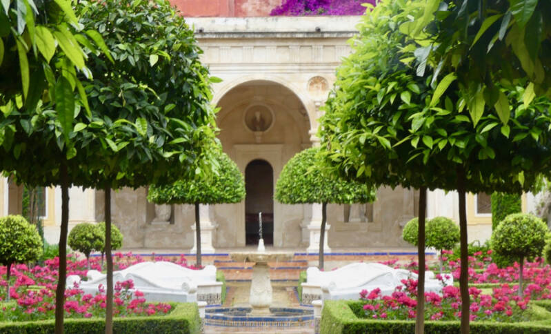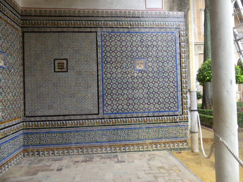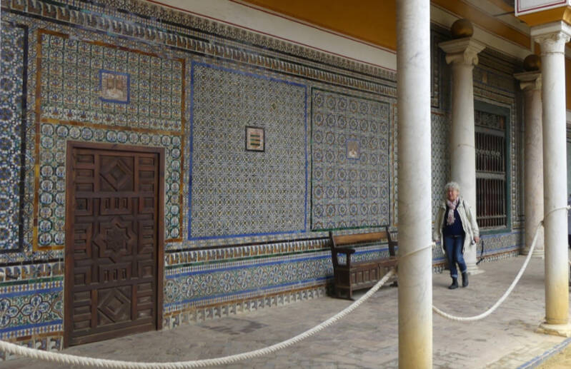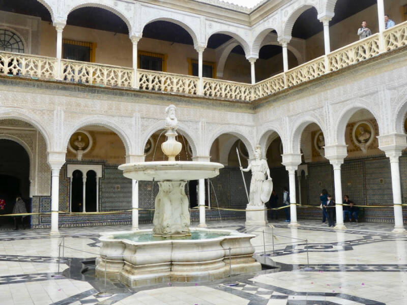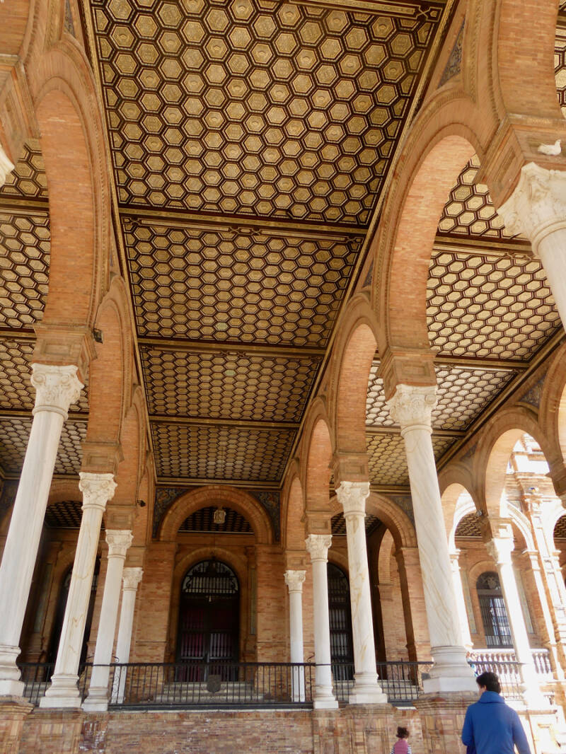 Casa de Pilatos dateert uit de 15e eeuw en is gebouwd in een mix van voor Mudéjar- en ook Italiaanse renaissance stijl. De muren zijn bekleed met azuléjos, zowel de tegeltjes als de kunstvorm ,die door de Moren vanuit Perzië hier werd gebracht, worden zo genoemd. Niet alleen in de muren met zijn mozaïeken van azuléjos, ook in de plafonds zie je de Moorse stijl terug. In de hoofdpatio zie je in de marmeren zuilen en bogen de mudéjarstijl terug terwijl de fontein renaissance is. Er staan in de hoeken Griekse beelden en aan de muren hangen 24 borstbeelden van Romeinse keizers. Verschillende kamers, weer met mooie muren en plafonds, komen op de patio uit en er zijn ook mooi aangelegde tuinen. Deze zijn weer in Renaissance stijl, een mooi geheel vormt zo deze benedenverdieping. Van de bovenverdieping vingen we een glimp op van enkele fresco’s en mooie plafonds.