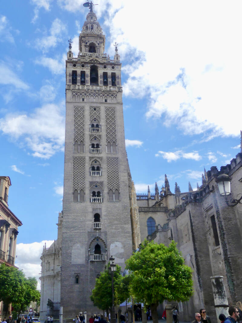 Daarna zijn we naar de universiteit van Sevilla geweest, een groot gebouw maar niet echt bijzonder. We wilden naar het toeristenbureau maar daar binnen stond een grote rij wachtenden. De grootste gotische kathedraal van Europa, Santa Maria de La Sede, konden we zelf wel vinden zonder plattegrond dus zijn we daar naar toe gewandeld. Het kent een paar mooie portalen, het mooist vinden we eigenlijk wel de minaret naast de kathedraal die 100m hoog is, uiteraard in Moorse stijl in de 12e eeuw gebouwd. Toen een aardbeving in de 14e eeuw het bovenste deel van de minaret verwoest, werd er later een klokkenstoel in renaissancestijl op gebouwd. Het interieur met o.a. het praalgraf van Columbus hebben we al eerder bezocht