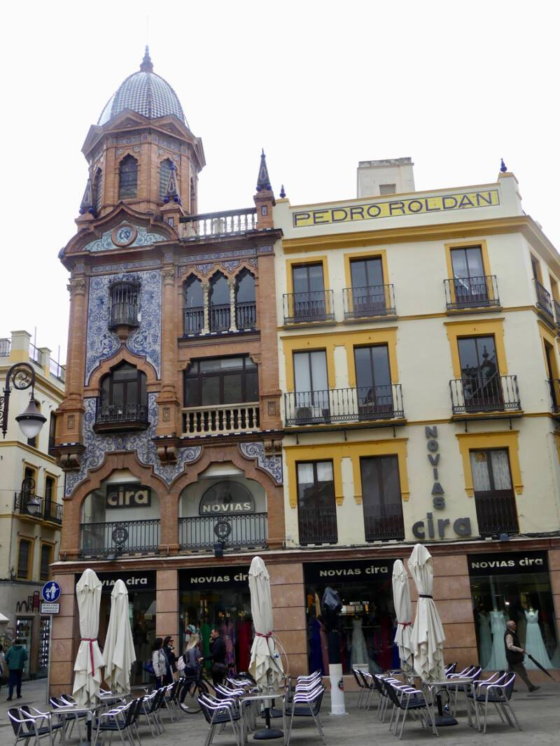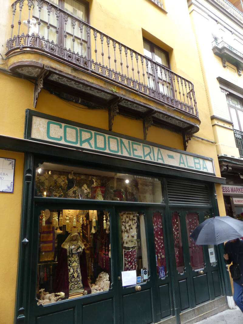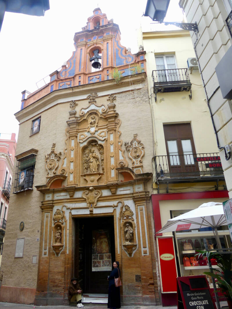 Wat foto's uit de wijk Santa Cruz: hierboven en linksonder een speciaalzaak, midden onder een van de kerken die je daar ziet en tenslotte een fraai huis.