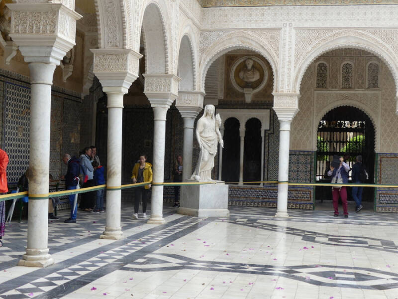 We zijn de wijk Santa Cruz ingewandeld, je vindt daar een mengeling van kleine straatjes, winkelstraten, warenhuizen, galerieën, kleine speciaalzaken etc. Gewoon een hele leuke wijk om doorheen te wandelen. Ook hier erg veel toeristen en toen we zelfs voor de kerk San Salvador een rij mensen zagen wachten kwamen we tot de conclusie dat we toch een verkeerde keuze hadden gemaakt om nu Sevilla te bezoeken. Waren we er de vorige keer vlak voor de Semana Santa en zijn we nu bewust tot na die heilige feestwijk in Marokko gebleven, we hadden er niet op gerekend dat de scholen in Spanje en w.s. de rest van Europa vakantie hebben. We wilden een stadspaleis bezoeken, Sevilla telt 3 van deze paleizen waar particulieren hebben gewoond.