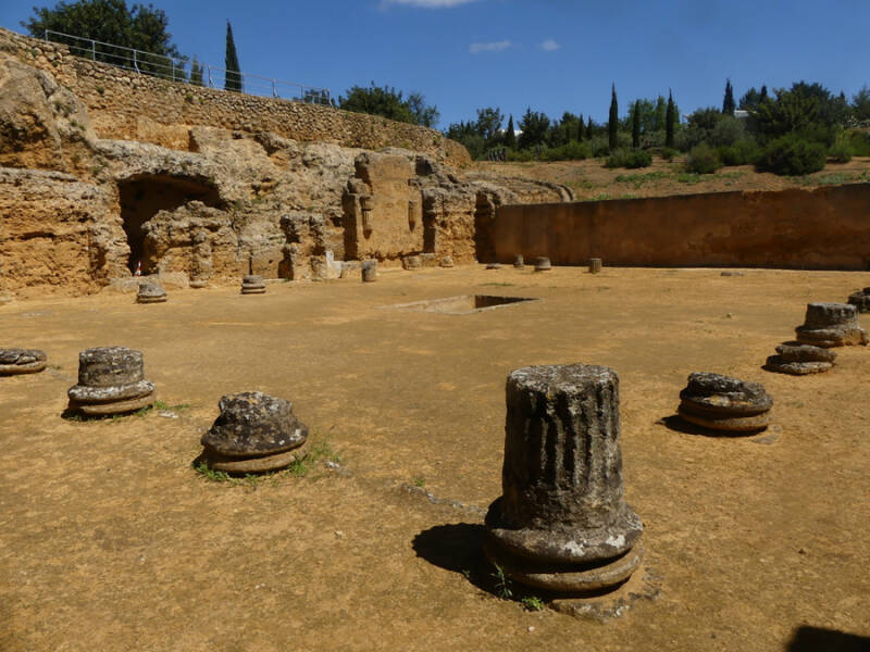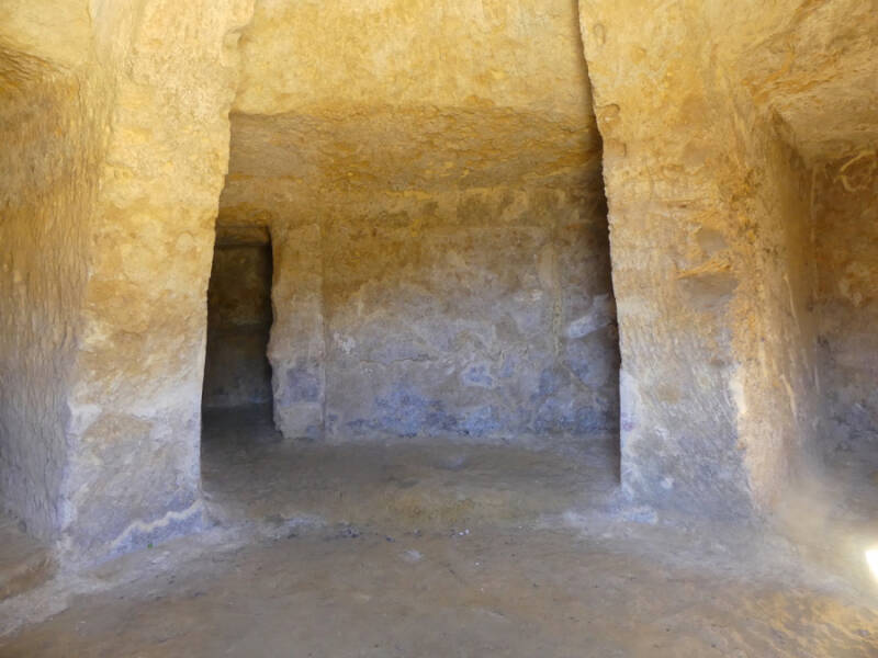 Nog een hele grote graftombe, deze is in hellenistische stijl. De foto links laat zien dat je afdaalt de tombe in, de middelste foto daar was je ooit ondergronds , er staan nog resten van zuilen en op de rechterfoto zie je de de graftombe die ooit muurschilderingen bevatte.