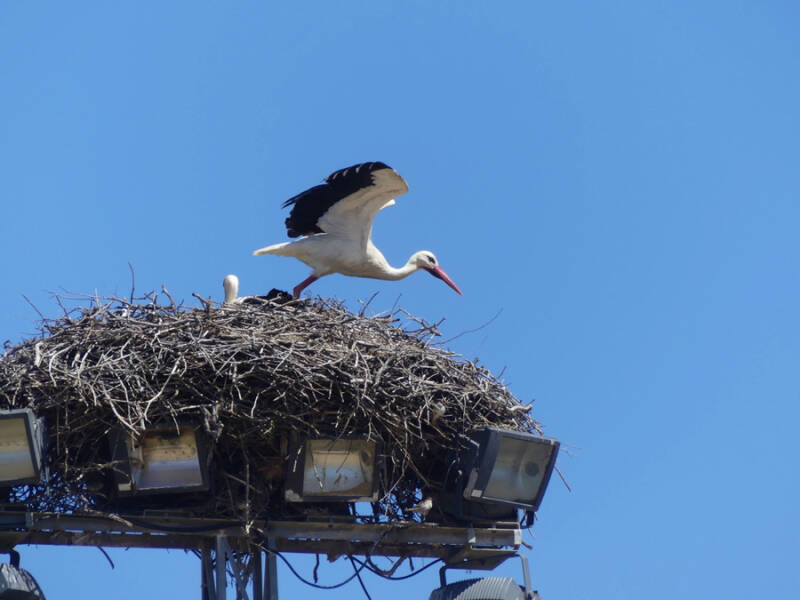 Na de boodschappen om een uur of 10 vertrokken voor een rit van bijna 230km naar Alange. Alange ligt niet ver van Mérida in de regio Extramadera aan een stuwmeer wat dan ook de Embalse (stuwmeer) van Alange heet. De cp ligt onder aan voet van het dorp, dat tegen een heuvel gebouwd ligt. We staan hier met maar met 3 campers, een leuke plek bij sportvelden, 2 ooievaarsnesten in lichtmasten, putters en groenlingen hoor je zingen en huis- en boerenzwaluwen halen hier modder uit een plas om een nest te bouwen en er zijn hops. De camperplaats is gratis met voorzieningen en ligt 200m van het meer..