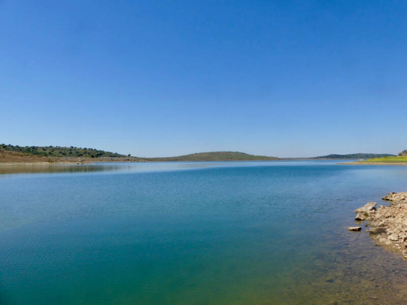 Ooievaars klepperen ’s nachts niet dus het was een stille nacht hier. We zijn vanmorgen een eindje rondom het meer gewandeld, er was weinig wind en het werd al snel warm na een frisse nacht met 10º.