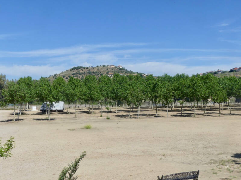 We kijken vanaf de camper ook op een Romaanse brug, pal daarachter maar wel 10km verwijderd, dat is wel grappig vanwege het contrast, ligt de zonnecentrale, de enige die Spanje rijk is. Het is wat anders dan een veld met zonnepanelen, die zijn er veel meer, maar hier wordt door middel van veel spiegels een zoutwater substantie in een hoge toren enorm opgewarmd en zo wordt d.m.v stoom een turbine aangedreven die stroom opwekt en 25.000 huishoudens van energie voorziet. Iets uitgebreider hebben we de de deze CSP (Concentrated Solar Power) beschreven bij onze Marokko reis, bij Ouarzazate ,.deel 9 Marokko 2019, 11-04-2019