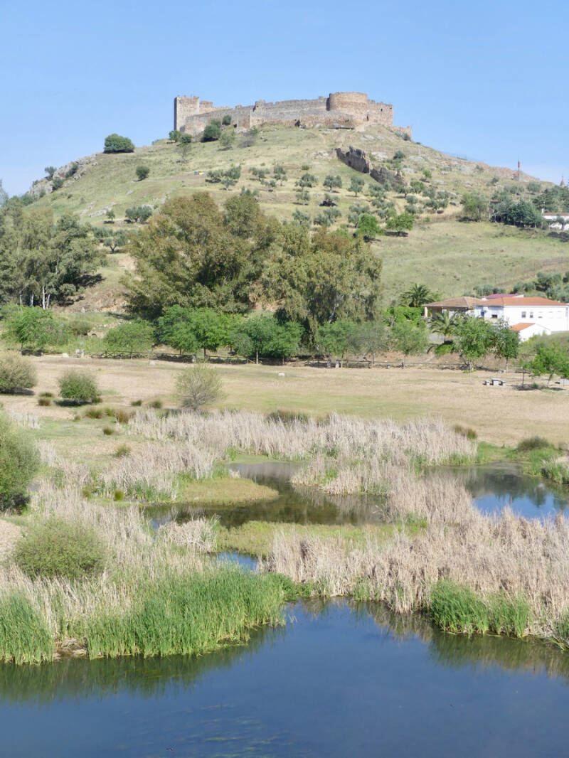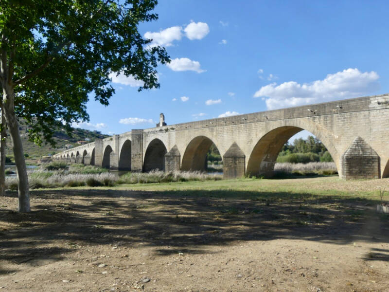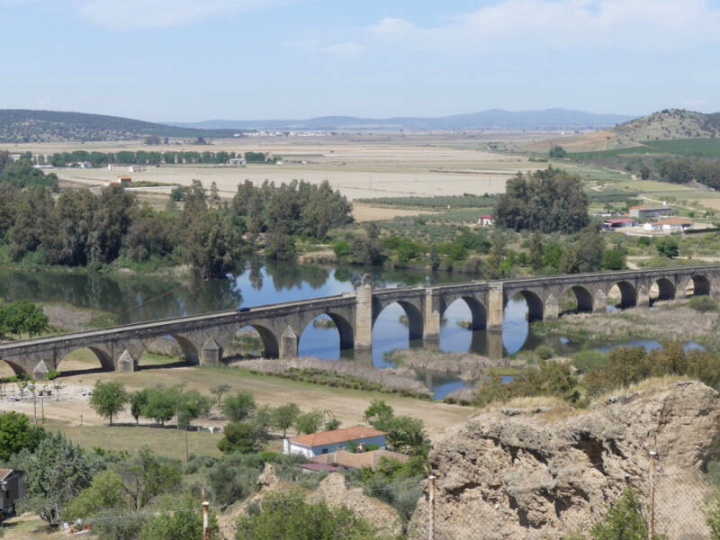 Over de rivier de Guadiana ligt een brug uit de 18e eeuw, deze ligt vlakbij de cp. ‘s Avonds schijnt hij verlicht te zijn, op dit moment is de zon nog niet onder. Er loopt een wandelweg langs de rivier de Guadiana, welke wij een stuk hebben gelopen. Het is een mooie rivier met ongerepte oevers met o.a riet waarin je rietzangers hoort zingen.