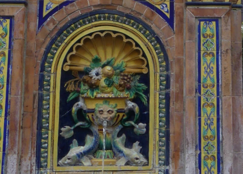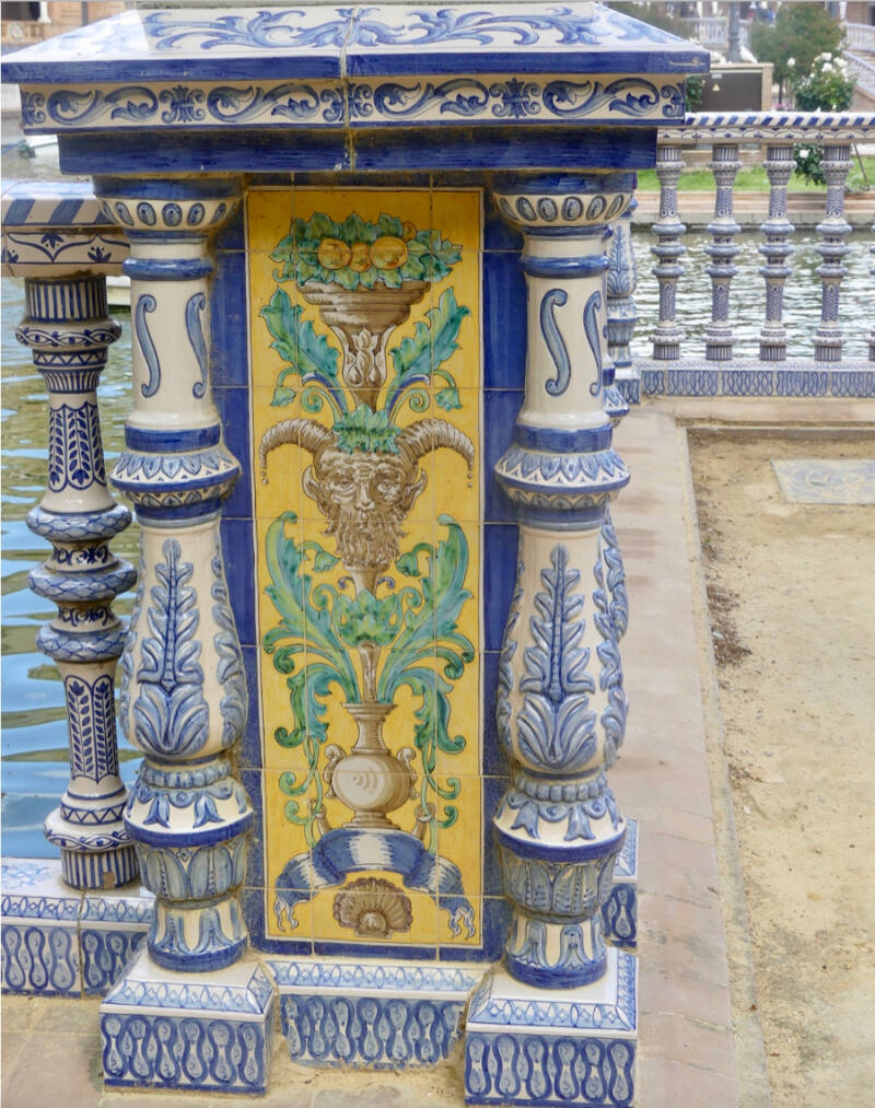 We hebben ons bijna en uur vergaapt aan dit prachtige bouwwerk met zijn vele mooi details. Onderaan de gevel zijn langs het hele gebouw 50 afbeeldingen gemaakt van de 50 Spaanse provincies, allemaal weer van azulejos.