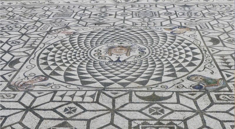 De Romeinse mozaïek in het gemeentehuis, in het midden Medusa, linksboven de winter, rechtsboven de zomer, rechtsonder de herfst, linksonder de lente
