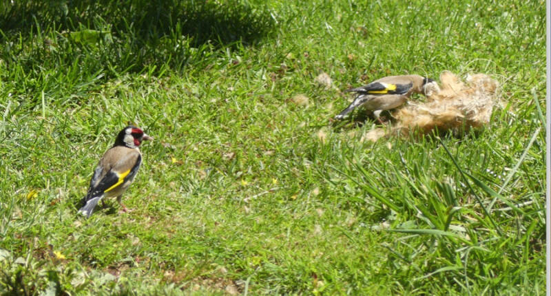 Paartje putters, vrouwtje verzamelt nestmateriaal