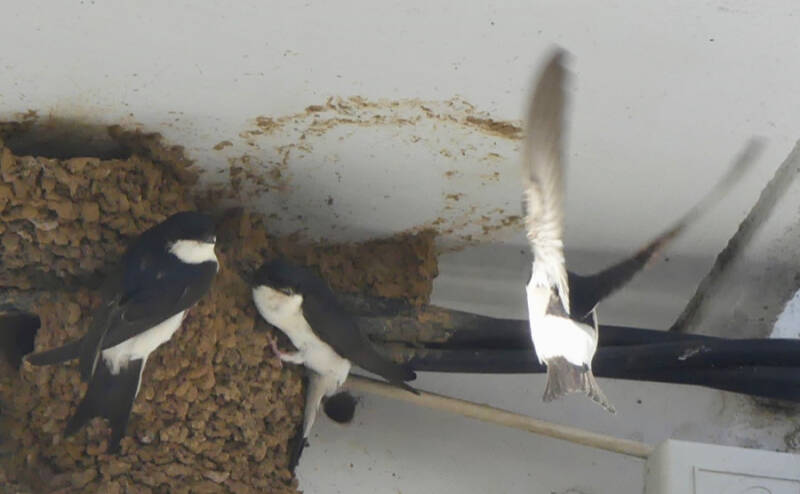 Er zijn zoals we gisteren al zeiden, veel zwaluwen in de weer om modder voor hun nesten te halen uit plassen hier dichtbij. Het zijn hoofdzakelijk huiszwaluwen, diegene die komt aanvliegen is een boerenzwaluw.