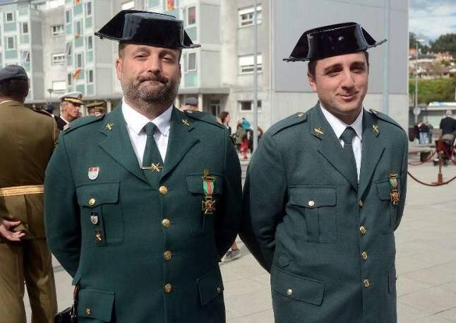 De Guardia Civil met hun, in ieder geval in de jaren 70 nog, merkwaardige hoofddeksels, het lijkt zelfs of deze mannen zich daar wat ongemakkelijk mee voelen.