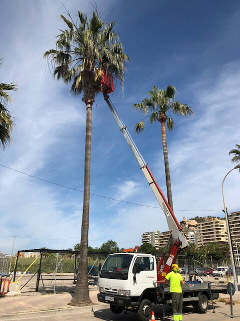 Hier worden palmbomen gesnoeid m.b.v. een hoogwerker, vorig jaar zagen we nog mannen deze werkzaamheden uitvoeren die met banden om hun lijf en beugels aan hun schoenen de boom in klommen