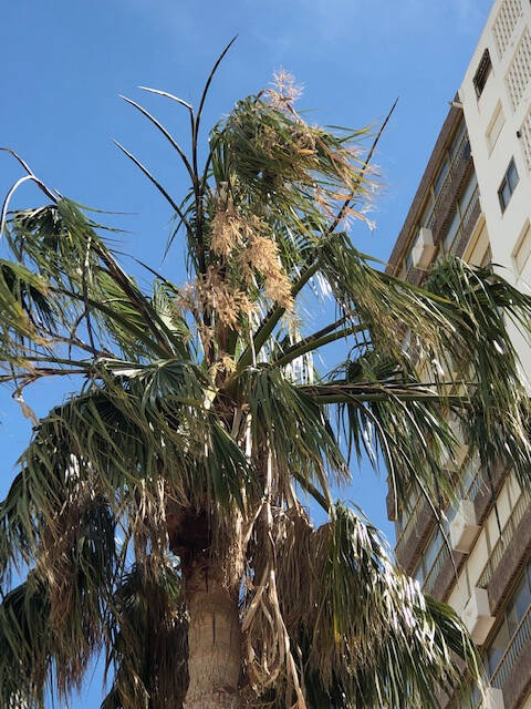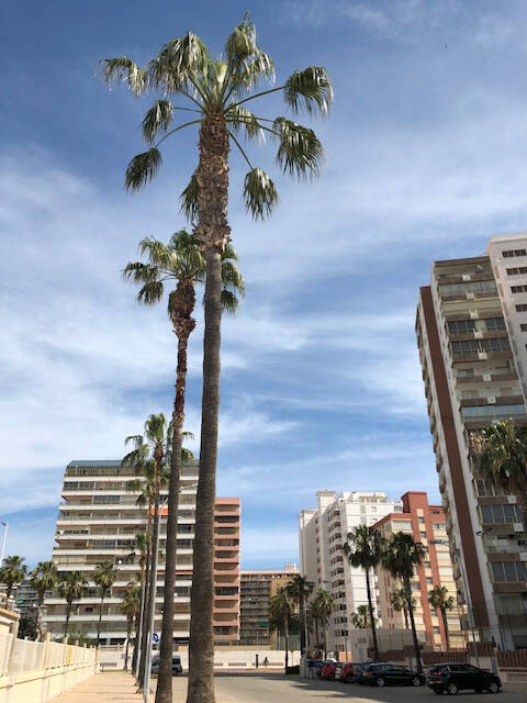 In Cullera staan oa langs de boulevard en de parallelweg, palmbomen die momenteel gesnoeid worden. Hier een ongesnoeid exemplaar.