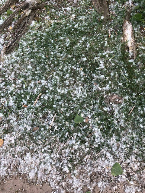 Ook bv in Nederland kennen we witte pluisjes die door de lucht vliegen in het voorjaar. Hier in Spanje is dat ook het geval maar dan nog veel meer dan bij ons, sommige grasvelden zijn aardig wit hier in de stad. In de pluizen, die afkomstig zijn van populieren en wilgen, zitten zaadjes verpakt. Populieren en wilgen zijn in het bezit van doosvruchten die in de voorzomer rijp worden en dan open springen, waarna de zaden vrijkomen, dit gebeurt bij de vrouwelijke bomen. De zaden kunnen zweven dankzij een ‘ kuif’ van haren die als een valscherm rondom het zaad aanwezig is. Het pluis dat wij als een soort zomersneeuw voorbij zien dwarrelen, is voor 90 procent het zaad al kwijt. De superlichte haren vallen op de grond en worden door de wind in beschutte hoekjes tot wollige bollen van formaat gebundeld. Veel zangvogels gebruiken het pluis om het nest te stofferen.