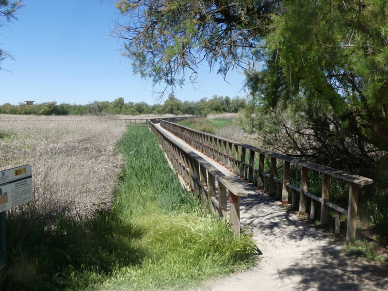 We hebben ons aangemeld bij het bezoekerscentrum, we wilden aanvankelijk daar overnachten . Er zijn 6 campers per nacht die mogen overnachten. Men is voorzichtig met toeristen, er zijn ook allerlei gedragsregels waar je je aan moet houden. Er zijn 3 wandelingen uitgezet, verkrijgbaar bij het bezoekerscentrum. WE hebben ruim 1,5 uur gewandeld, deels over paden, deels over vlonders die over de vennetjes en de moerassen liggen. Het is een erg mooi natuurgebied, we hebben heerlijk gewandeld, ondertussen speurend naar vogels. Er zijn vooral grauwe gorzen en putters, ook wat kneutjes. We hebben 3 gieren zien cirkelen en een paar voor ons onbekende eenden gespot.