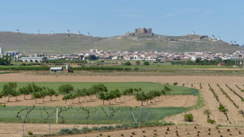 We zijn vanmorgen 240km door Castilla-La Mancha gereden, de regio die midden in Spanje ligt. Eerst langs weilanden met koeien maar het landschap veranderde na Toledo , toen werden het grote olijfbomen plantages en wijngaarden waarvan de druivenstokken die al mooi waren uitgelopen. We kwamen in La Mancha, het gebied van de windmolens van Don Quichotte waar we bijna 2 jaar geleden alweer in het dorp Consuegra waren geweest. We wilden naar het natuurgebied Las Tablas de Daimiel maar we bedachten onderweg dat het misschien verstandiger was om daar morgen heen te gaan. Er mogen officieel maar 6 campers tegelijk in het park en aangezien het zondag is leek het toch beter om daar morgen heen te gaan